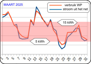 Vergelijk dit alles met dezelfde maand in 2025 toen er nog geen thuisbatterij achter de meter stond. Het (net) stroomverbruik gaat ongelooflijk keurig op met het verbruik van de warmtepomp. In maart 2025 werd 654 kWh van het net betrokken. Dat is een enorm verschil met dit jaar, liefst 520 kWh!