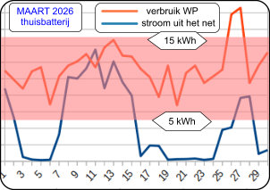 Een maand thuisbatterij in vol bedrijf levert aardige verschillen op met de situatie vorig jaar toen er nog geen thuisbatterij stond. Uit het plaatje is af te lezen dat de warmtepomp afgelopen maand gemiddeld 11-12 kWh per dag verbruik voor zijn rekening nam. Import uit het net was alleen behoorlijk in de sombere periode tussen 8 en 16 maart, en verder laag of zelfs nul. In absolute eenheden werd in maart 2026 in totaal 134 kWh uit het net betrokken.
